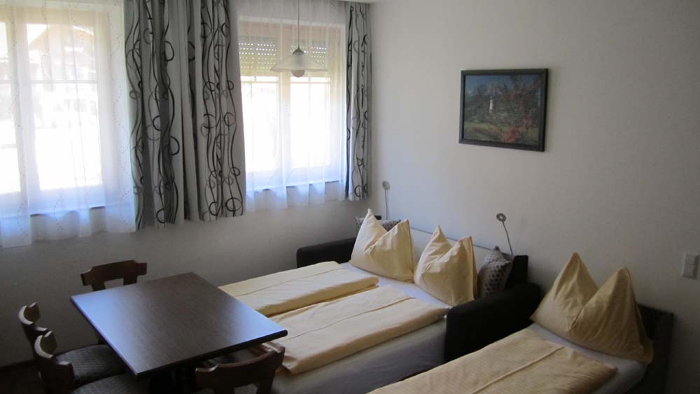 Die Ferienwohnung verfügt über einen Wohn-Schlafbereich sowie ein separates Schlafzimmer mit einem Doppelbett, kleinem Schreibtisch und SAT-TV. Im Wohnschlafzimmer befinden sich ein Doppelschlafsofa sowie ein Schlafsofa für eine Person, Sat-TV und ein Safe für die Aufbewahrung Ihrer Wertgegenstände. Die moderne Wohnküche ist komplett eingerichtet und mit einem Dunstabzug, Ceranfeld, Backrohr, Mikrowelle, Kühlschrank mit einem kleinen Gefrierfach sowie Geschirrspüler, Filterkaffeemaschine und Wasserkocher ausgestattet. Der Esstisch lädt zum gemeinsamen Speisen ein. Neben einem separaten WC finden Sie im Badezimmer ein Doppelwaschbecken, einen Handtuchtrockner und einen Föhn.