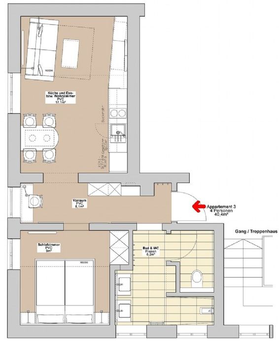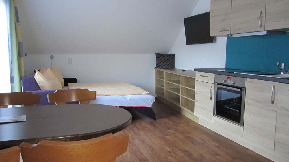 Die Wohnung verfügt über ein separates Schlafzimmer mit einem Doppelbett und SAT-TV. Im Wohnschlafraum gibt es ein Doppelschlafsofa, das um ein Babybett ergänzt werden kann. Außerdem finden Sie dort einen kleinen Schreibtisch sowie einen Safe für Ihre Wertgegenstände vor. Die moderne Wohnküche ist komplett eingerichtet und mit Dunstabzug, Ceranfeld, Backrohr, Mikrowelle, Kühlschrank mit einem kleinen Gefrierfach, Geschirrspüler, Filterkaffeemaschine und Wasserkocher ausgestattet. Der Esstisch lädt zum gemeinsamen Speisen ein.